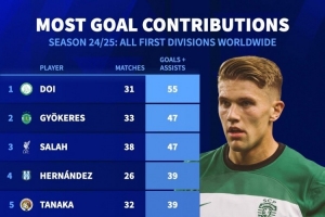 体育资讯7月23日讯 德国转会市场统计了球员上赛季在顶级联赛(指各国一级联赛)的参与进球数量,并列出榜单,土井智之在新加坡联赛参与55球居首,约克雷斯、萨拉赫排名前三。